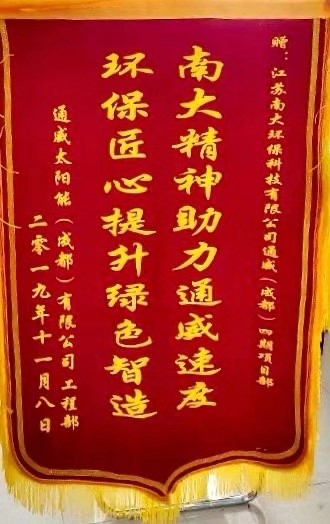 近日,江蘇南大環保科技有限公司收到通威太陽能(成都)有限公司的錦旗和表彰信,南大環保在年產3.8GW高效晶體硅太陽能電池互聯工廠建設項目中,面對困難勇于擔當,全力攻克,為保障業主生產調試廢水出水任務做出突出貢獻。